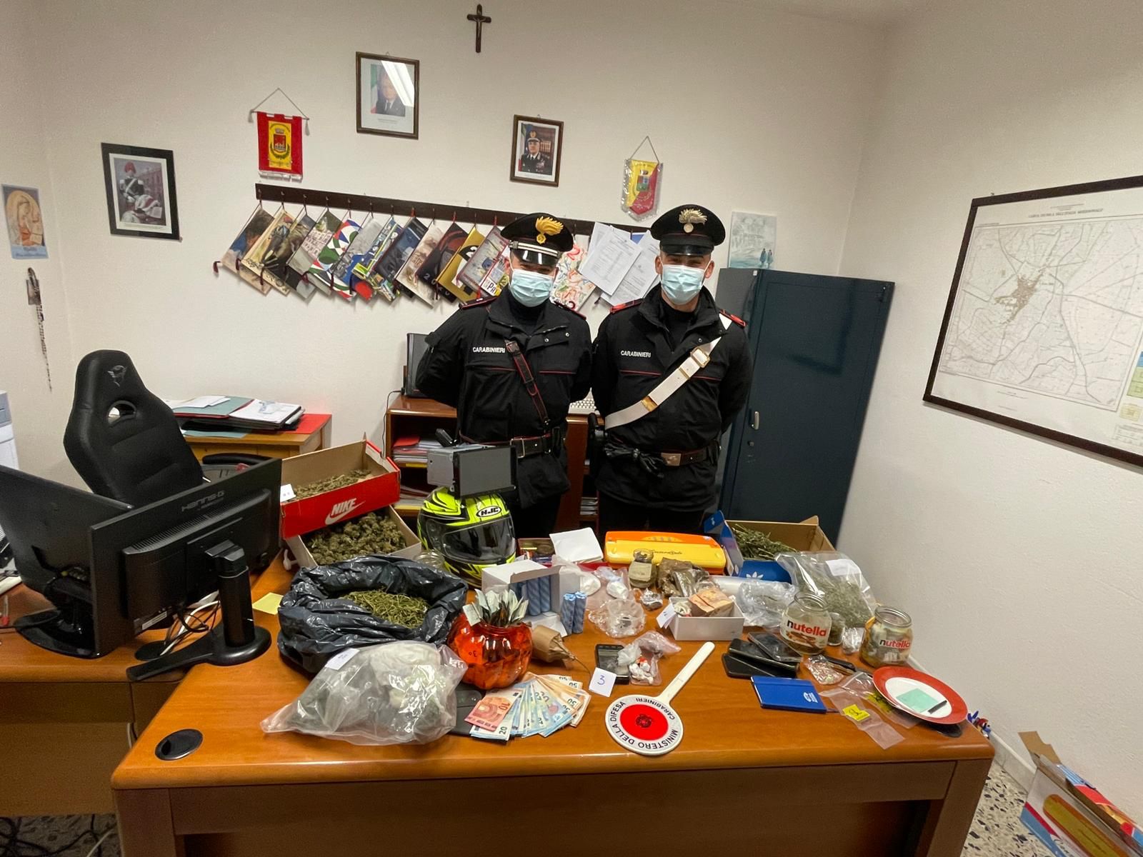 I carabinieri hanno organizzato un blitz nella casa della coppia, trovando sia gli oggetti rubati dall’auto sia 1,1 chili di marijuana, 83 grammi di cocaina, 55 di eroina, 207 di hascisc e una pasticca di ecstasy. Ritrovati e sequestrati anche 23 petardi, una bomba carta, 2930 euro in banconote da vario taglio, materiale atto al confezionamento dello stupefacente ed un bilancino elettronico di precisione.