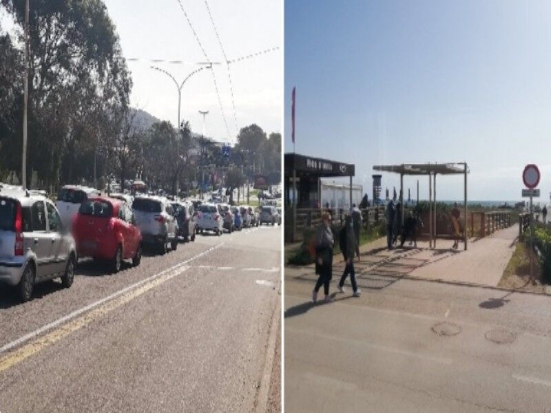 I chioschi sono quasi tutti operativi, i più temerari tentano una tintarella decisamente fuori stagione. I surfisti sono i padroni del mare, un trentenne si cambia velocemente in via Ausonia seduto direttamente sul cofano dell’auto prima dj prendere tra le mani la tavola e raggiungere la spiaggia. Prima, all’altezza del Cavalluccio Marino, papà e mamme spingono i bimbi sulle altalene dell’area giochi accanto ai caddozzoni, dove abbondano panini con wurstel e patatine. Dal rudere dell’ex Marino sino al Margine Rosso è terra di runner e pattinatori, mentre spunta addirittura qualche persona a cavallo in spiaggia. Le mascherine? Ci sono, calate sul volto di chi ha raggiunto il mare. Pieno, come da copione, il parcheggio-sterrato prima di Marina Piccola, auto su auto anche nelle vie del rione del Poetto. La spiaggia dei Centomila è viva, la voglia di tante famiglie è quella di respirare in una Sardegna gialla, con la possibilità di spostarsi tra i Comuni e di pranzare all’aria aperta, senza limitazioni orarie, almeno sino alle 18.