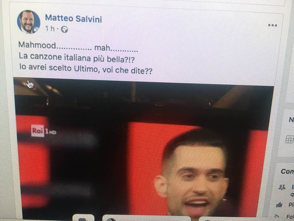 Matteo Salvini ironizza su Mamhood, il giovane sardo egiziano che vince Sanremo: “Mahmood…………… mah…………La canzone italiana più bella?!? Io avrei scelto Ultimo, voi che dite??”. Solo un parere musicale? Salvini twitta il commento proprio mentre Mentana scrive: “Che colpo la vittoria di Mamhood!”. Incredibile ma vero: la classifica del festival diventa il teatro di uno scontro politico e ideologico. Proprio a due settimane dalle elezioni regionali in Sardegna. La vittoria del ragazzo con madre di Orosei e papà egiziano, con una canzone intitolata “Soldi” che parla di povertà e di lotta tra le periferie, non è piaciuta evidentemente al ministro dell’Interno.