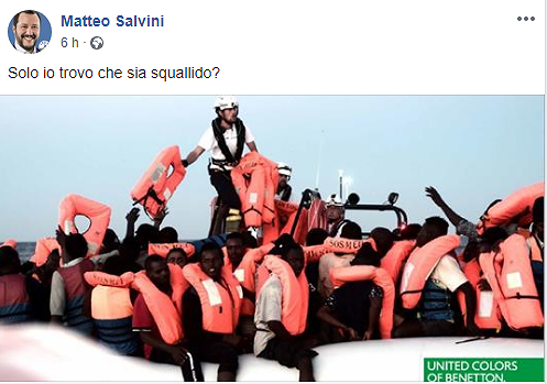 Un gommone con a bordo decine di migranti, salvati dalla Ong Sos Med, è la provocatoria campagna pubblicitaria del noto marchio United Colors of Benetton ideata dal provocatorio fotografo Oliviero Toscani, contro la quale si è scagliata prima la Lega, e poi il Ministro dell’interno Matteo Salvini, che con un post oggi ha condiviso l’immagine scrivendo “Solo io trovo che sia squallido?”. Subito a migliaia like e commenti a supporto del vice premier, che si è capito molto bene sa usare perfettamente i social per la sua propaganda.