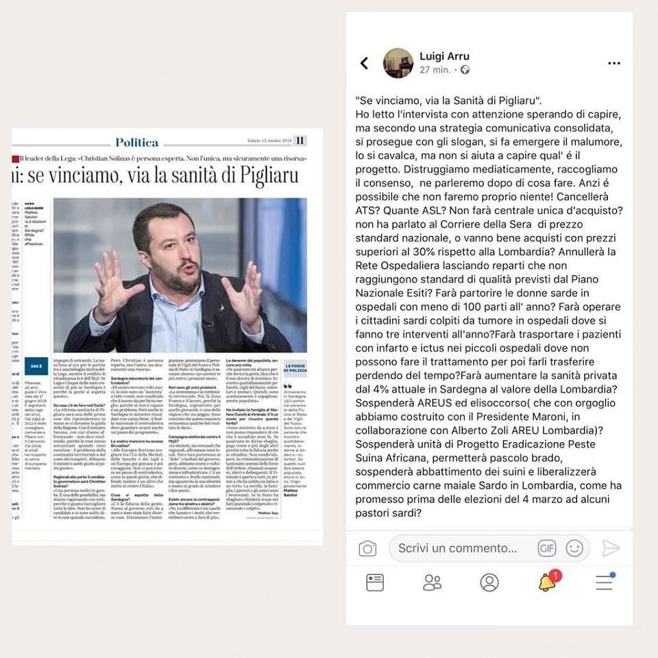 Ho letto l’intervista con attenzione sperando di capire, ma secondo una strategia comunicativa consolidata, si prosegue con gli slogan, si fa emergere il malumore, lo si cavalca, ma non si aiuta a capire qual é il progetto. Distruggiamo mediaticamente, raccogliamo il consenso, ne parleremo dopo di cosa fare. Anzi é possibile che non faremo proprio niente! Cancellerà l’ATS? Quante ASL? Non farà la centrale unica d’acquisto? Non ha parlato al Corriere della Sera di prezzo standard nazionale, o vanno bene gli acquisti con prezzi superiori al 30% rispetto alla Lombardia? Annullerà la Rete Ospedaliera lasciando reparti che non raggiungono standard di qualità previsti dal Piano Nazionale Esiti? Farà partorire le donne sarde in ospedali con meno di 100 parti all’anno? Farà operare i cittadini sardi colpiti da tumore in ospedali dove si fanno tre interventi all’anno? Farà trasportare i pazienti con infarto e ictus nei piccoli ospedali dove non possono fare il trattamento, per poi farli trasferire perdendo del tempo? Farà aumentare la sanità privata dal 4% attuale in Sardegna al valore della Lombardia? Sospenderà AREUS ed elisoccorso (che con orgoglio abbiamo costruito con il Presidente Maroni, in collaborazione con Alberto Zoli AREU Lombardia)? Sospenderà l’unità di Progetto Eradicazione Peste Suina Africana, permetterà il pascolo brado, sospenderà l’abbattimento dei suini e liberalizzerà il commercio di carne di maiale Sardo in Lombardia, come ha promesso prima delle elezioni del 4 marzo ad alcuni pastori sardi?