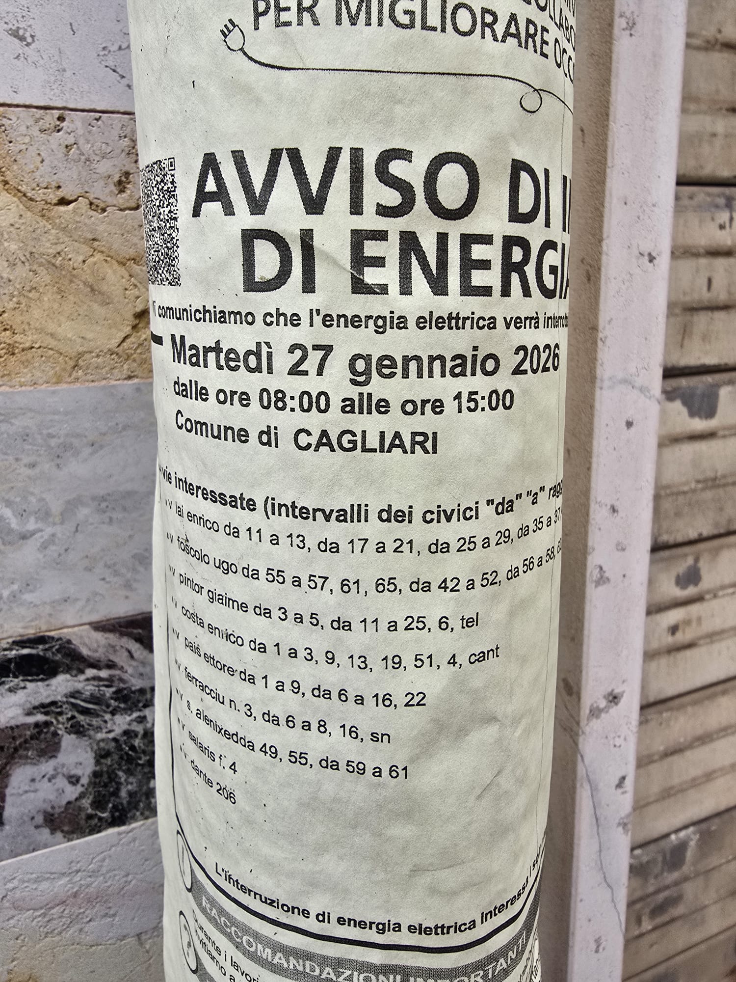 Nel quartiere San Benedetto, cuore pulsante della città, la modernità sembra fermarsi davanti a un palo della luce. Nell’era degli smartphone, delle notifiche in tempo reale e dei servizi digitali, i cittadini continuano a essere avvertiti di disagi gravi come un blackout di otto ore tramite fogli incollati alla buona sulla strada, confusi tra pubblicità e annunci di ogni genere.
