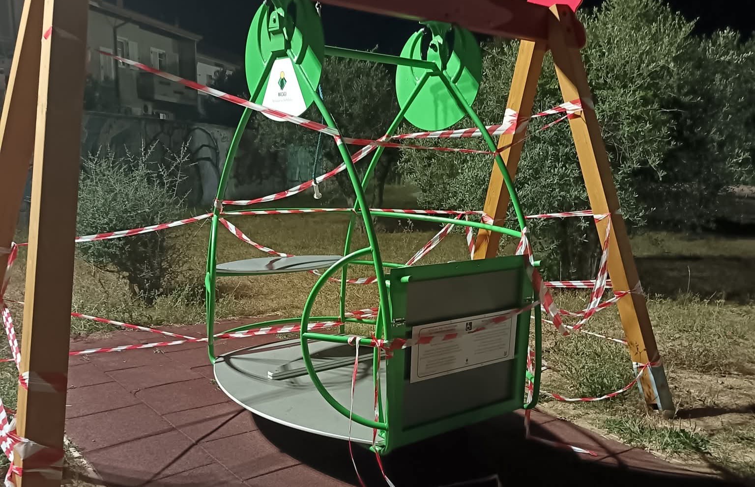 Avvolto nel nastro in attesa della manutenzione, ecco come si presenta l’altalena inclusiva: non praticabile. La segnalazione è stata esposta pubblicamente da un cittadino al fine di richiamare grandi e piccoli a un rispetto maggiore nei confronti del bene comune. Un parco per tutti, insomma, dove poter giocare all’aria aperta e socializzare senza dover assistere ad atti consumati con leggerezza che possono causare spiacevoli danni come in questo specifico caso.
