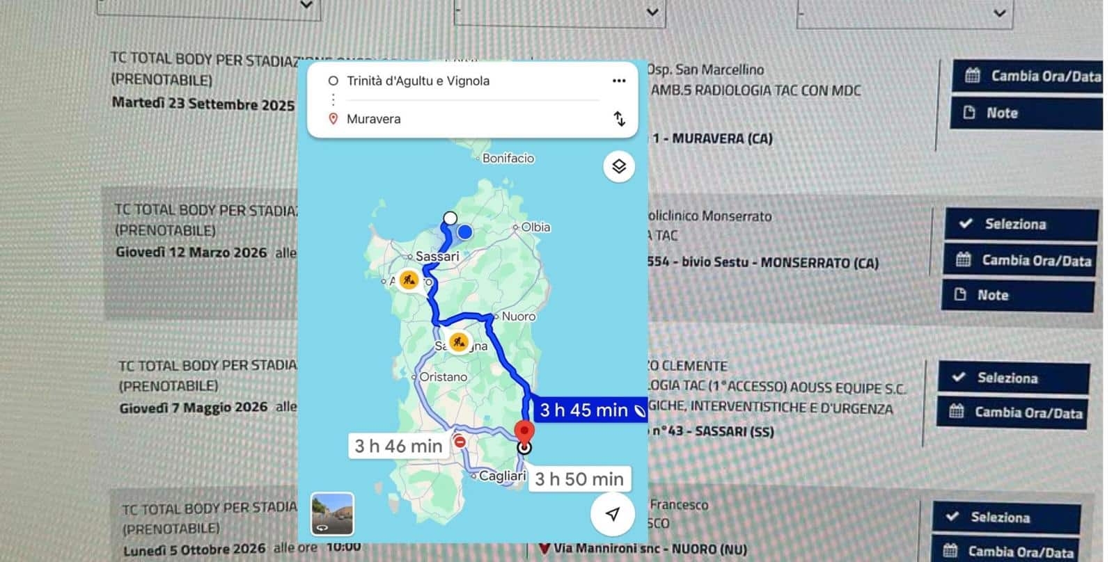 – Una paziente oncologica della Gallura, per una semplice prenotazione di una Tac total body di stadiazione, si è vista fissare l’appuntamento il 23 settembre a Muravera. Un dettaglio che fa la differenza: tre ore e quarantacinque minuti di viaggio, 300 chilometri di distanza, partenza alle prime luci dell’alba per arrivare in tempo alle 8. Un’odissea resa ancor più insostenibile per chi è già debilitato dalla malattia.