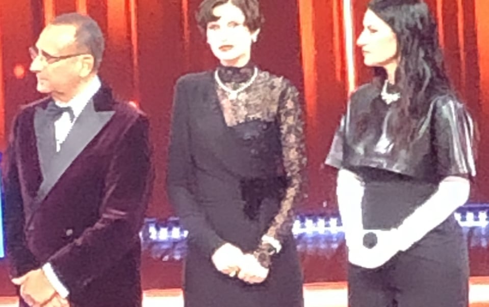 Sul palco accanto a Carlo Conti e Laura Pausini la meravigliosa Bianca Balti, che torna a distanza nel ruolo di co-conduttrice, e a sorpresa Alessandro Siani.