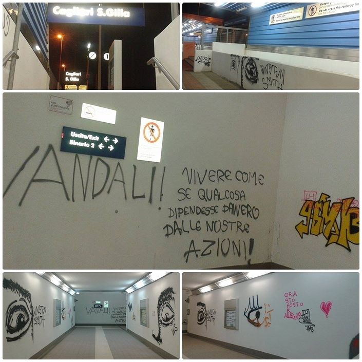 LA FRASE. “Vandali, vivere come se qualcosa dipendesse davvero dalle nostre azioni”. Un lungo passaggio sotterraneo, per fortuna illuminato, è meta di chi sporca, deturpa e “accarezza” se così si può dire le bianche pareti di quello scalo a due passi da via Santa Gilla: non ci sono clochard o tracce di tossici, soltanto il vociferare di alcuni giovani che bevono alcune birre in bottiglia seduti per terra accanto ai binari, ma tutto appare tranquillo. Unica nota storta, quei pasticci e non conclamate opere d’arte dei cosiddetti artisti di strada che se proprio volessero, potrebbero invece creare capolavori variopinti, come spesso si intravvedono nei muri della città.