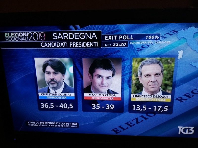 Christian Solinas tra il 36,5 e il 40,5 e Massimo Zedda tra il 35 e il 39 per cento. Così il secondo e ultimo exit poll Rai sulle Regionali 2019 in Sardegna. Un punto e mezzo di vantaggio per il candidato del centrodestra su quello del centrosinistra. Il Movimento 5 Stelle, con Francesco Desogus, saldamente terzo con una “forchetta” numerica compresa tra il 13,5 e il 17,5 per cento. Le proiezioni mostrano quindi una battaglia. Ovviamente, per attendere i dati reali bisogna attendere la giornata di domani, lunedì 25 febbraio, lo spoglio dei voti inizia alle sette del mattino.