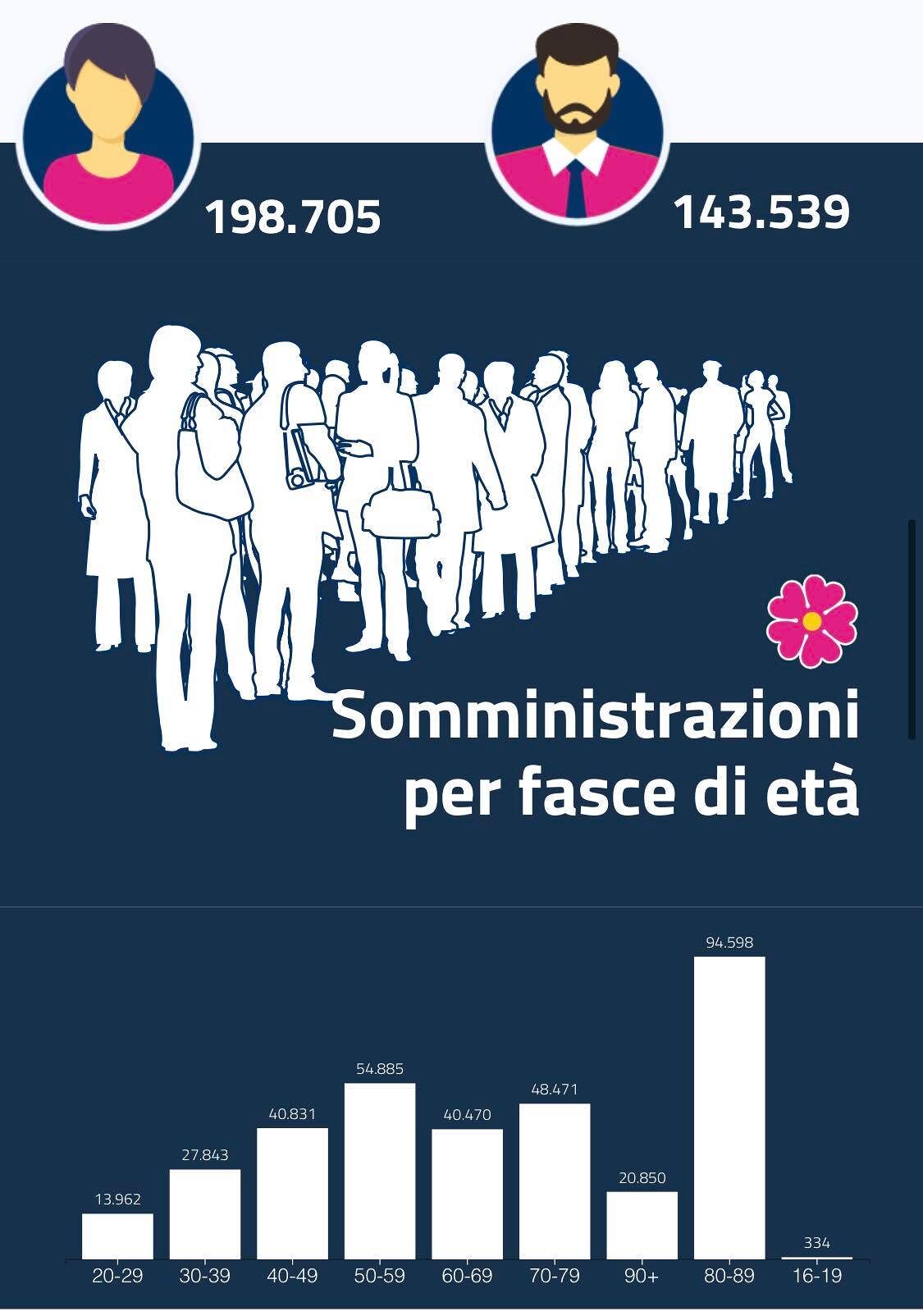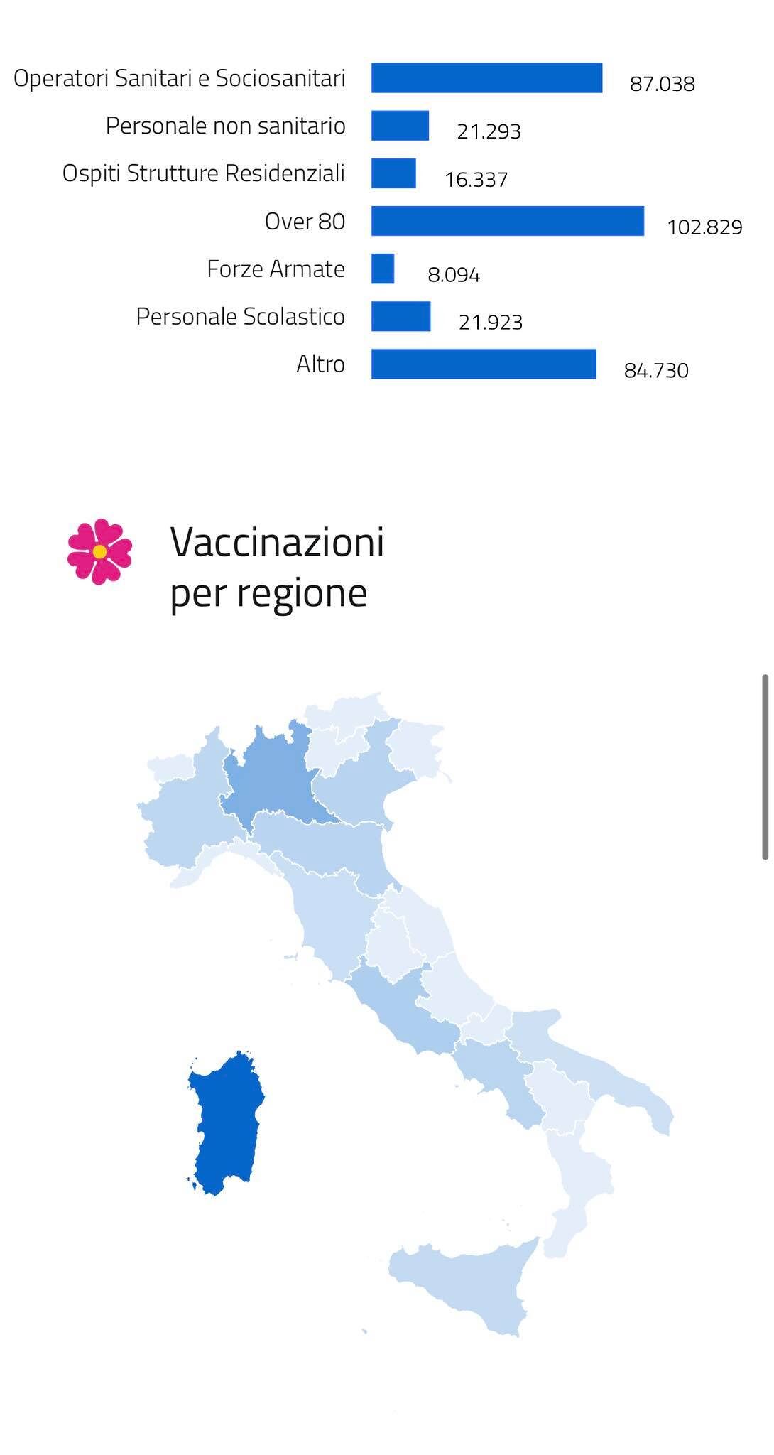 E come sono state suddivise per categoria? Secondo il report ufficiale: 87.038 agli operatori sanitari e sociosanitari, 21.293 personale non sanitario, 16.337 agli ospiti delle Rsa, 102.289 agli Over 80, 8.094 alle Forze Armate, 21.923 al personale scolastico. E poi c’è un dato che colpisce ben 84.730 somministrate alla categoria “Altro”.