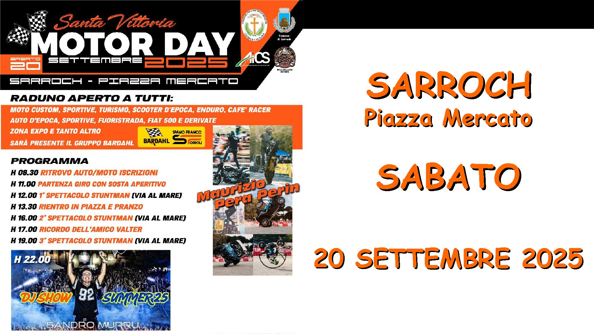 Prenderà il via sabato 20 Settembre la prestigiosa rassegna nell’area della Piazza Mercato a Sarroch, per un fine settimana dedicato ai motori, alla musica ed allo spettacolo.