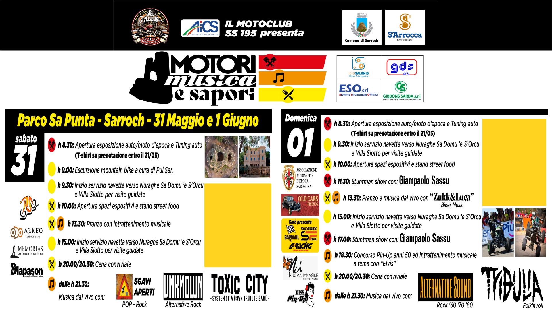 Prenderà il via sabato 31 Maggio e proseguirà nella giornata di domenica la prestigiosa rassegna al Parco di “Sa Punta” di Sarroch, per un fine settimana all’insegna della passione per i motori, della musica dal vivo, della buona cucina, unite alla valorizzazione delle bellezze del territorio. Sarà infatti possibile visitare il “Nuraghe Sa Dome S’ Orcu” e la Villa Siotto.