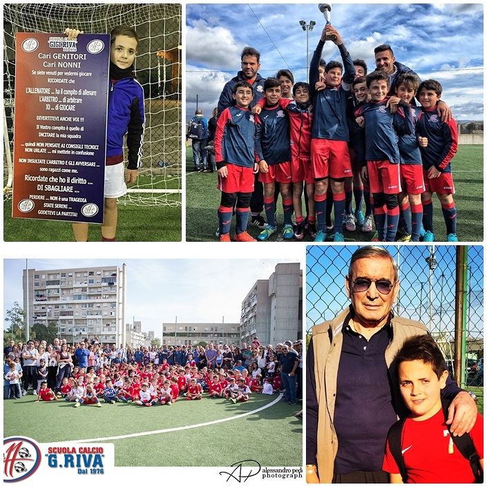 GLI ALBORI. Al via la stagione 20015-2016, in concomitanza con il compleanno della società. Quarant’anni ad insegnare fair play, stop di piatto e cross di destro e sinistro. Ma soprattutto, un modo di fare sport che ancor prima di formare calciatori, punta a creare buoni cittadini. La Scuola calcio Gigi Riva festeggia i quattro decenni di attività e riparte il 14 settembre. Sui campi dell’Amsicora e del Consorzio Calcio Sant’Elia 2005. Lunedì 1° settembre aprono le iscrizioni. Lo staff della scuola, dai direttori generale e tecnico Daniele Cortis ed Enzo Molinas, con la supervisione del presidente e del vice Gigi e Nicola Riva, sono al lavoro. Di fatto, la prima Scuola calcio in Italia è a disposizione dei bambini. Futuri campioni e buoni italiani. “Cagliari, mare profumo di mare ancora rimandato – aggiunge Ferdinando Sechi – oggi inizia una grande festa quella del 40° anniversario della scuola calcio Gigi Riva. La festa della prima scuola calcio della Sardegna, la festa del mito “Rombo di Tuono” che la fondò nel 1976 e di tutti i suoi allievi quelli di oggi e quelli di ieri. Mio figlio, quello con Gigi e con il cartello in mano, è al settimo anno di attività ed è molto soddisfatto perché si è ritrovato più che in una società sportiva in un gruppo di veri amici, in cui il risultato è secondario rispetto allo spirito di gruppo”