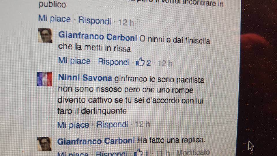 Nuove clamorose minacce di Sel ai giornalisti cagliaritani e alla libertà di stampa. Questa volta è direttamente un candidato nella lista di Sel a Cagliari, il partito del sindaco Massimo Zedda, a esprimersi con chiare minacce contro la stampa libera: “Farò il delinquente, voglio incontrarti in pubblico”, scrive il candidato Ninni Savona nella bacheca del nostro capo redattore Jacopo Norfo. Queste le frasi di Ninni Savona nel post che abbiamo fotografato: “Non sono andato all’universita pero ti vorrei incontrare in publico”, scrive sbagliando oltretutto l’ortografia. Poi nel rispondere a un commento di Gianfranco Carboni che lo invitava alla calma va giù duro con altre minacce fisiche targate Sel: “Gianfranco, io sono pacifista non sono rissoso pero che uno rompe divento cattivo se tu sei d’accordo con lui faro il delinquente”. Gianfranco Carboni è editorialista di Casteddu Online ed è candidato con la lista Anno Zero di Massidda.