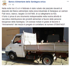 Da qui l’accorato appello:“Il furto ci priva di uno strumento indispensabile nella nostra attività di raccolta e distribuzione dei prodotti alimentari a favore delle persone bisognose della Sardegna. Chi avesse notizie in grado di favorire il “ritrovamento” del mezzo è pregato di contattarci al numero 0708474027. Si tratta di camion Fiat Iveco, bianco, targato CA 647489″