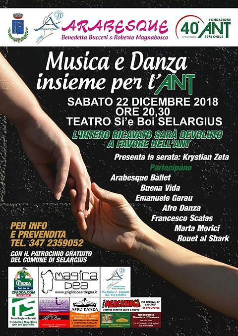 Il 22 dicembre alle 20.30 serata di beneficenza al Teatro Sì è Boi per aiutare Fondazione ANT In occasione del 40° Anniversario della Fondazione Ant Italia Onlus. Sabato 22 dicembre ore 20.30 presso il Teatro Si è Boi a Selargius, grazie al Patrocinio del Comune di Selargius si terrà una serata di beneficenza intitolata “Musica e Danza per l’Ant grazie alla collaborazione di Benedetta Bucceri e Roberto Magnabosco, presenterà la serata Krystian Zedda, ospiti speciali Emanuele Garau, si esibiranno Arabesque Ballet, Burna Vi da, Afro Danza, Marta Morici, Ruote al Shark.