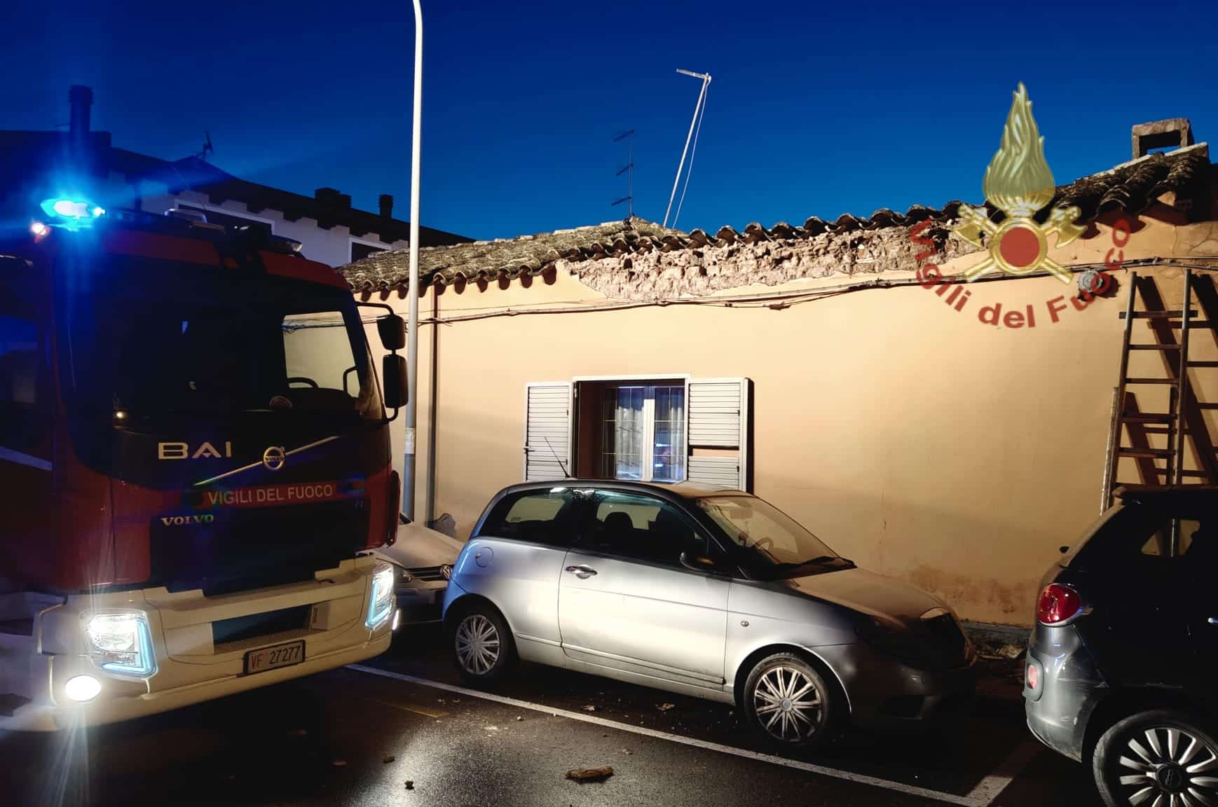 con distacco e caduta di elementi costruttivi (tegole parti di cemento, intonaco) che si sono riversati in strada e nel marciapiede.