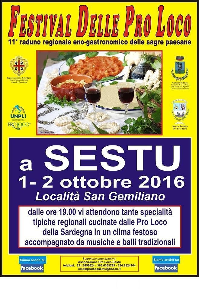 Si rinnova anche quest’anno l’11° raduno regionale eno-gastronomico delle sagre paesane. Sabato 1 e domenica 2 ottobre 2016, a partire dalle ore 19, presso la località campestre di San Gemiliano a Sestu, si svolgerà il Festival delle ProLoco. La scelta di tale luogo è determinata dalla suggestiva posizione e dalla conformazione delle “Lollas” delle mura di cinta che circondano la chiesetta campestre, idonee a ospitare le Pro Loco, nonchè dall’opportunità di fruire della gentile collaborazione offerta dalle associazioni operanti presso la località e dalle stesse autorità parrocchiali.