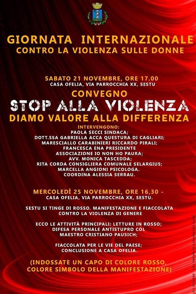 «Stop alla violenza, diamo valore alla differenza». Uno slogan forte, mirato, concreto: Il Comune di Sestu scende in campo con fermezza e lo fa con il convegno sul tema “No alle Violenze sulle donne”, previsto per sabato 21 Novembre, alle ore 17, presso i locali di “Casa Ofelia”, in via Parrocchia a Sestu: interverranno tra gli altri, il primo cittadino, Paola Secci, la dott.ssa Gabriella Acca, della Questura di Cagliari, Riccardo Pirali (comandante stazione Carabinieri Sestu), l’associazione “Io non Ho Paura”, (con la presidente, Francesca Ena), l’avvocato Monica Tascedda, la consigliera comunale di Selargius, Rita Corda, Marcella Angioni (psicologa), mentre i lavori saranno coordinati da Alessia Serra: «Tutte potremmo esser inconsapevoli vittime – spiega con decisione, Francesca Ena, portavoce dell’associazione, “Io Non Ho Paura”– è fondamentale modificare questa situazione, insorgere affinchè ci sia certezza della pena e maggior severità delle stesse. La violenza viene vissuta dai bambini che assistono, con gli stessi effetti di chi la subisce direttamente».