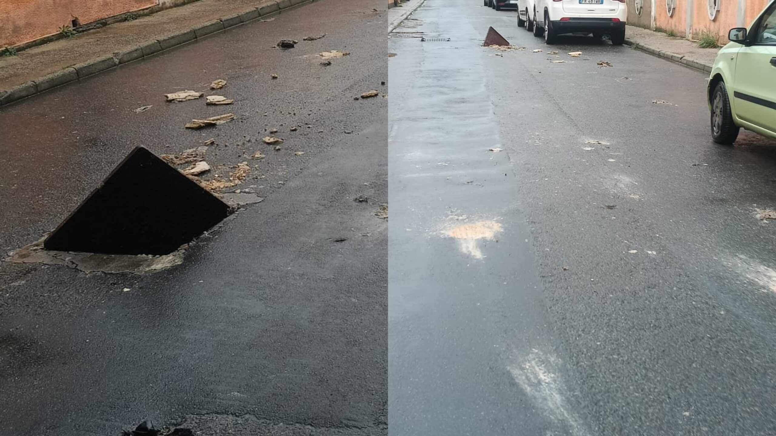 Le fotografie mostrano chiaramente non solo la presenza di residui e materiale sparso sulla carreggiata, ma anche una situazione di evidente pericolo per la pubblica incolumità: un chiusino/tombino aperto o divelto in mezzo alla strada, con il relativo coperchio spostato, in una via frequentata da residenti, auto e pedoni. A questo si aggiunge il fatto che, nonostante le segnalazioni, non è stata neppure effettuata la pulizia della strada.