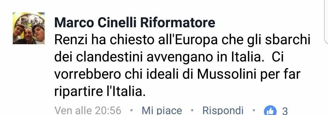 Bufera sul post “fascista” di un consigliere di Sestu, che invoca addirittura “gli ideali di Mussolini” per gli sbarchi dei migranti in Italia. Marco Cinelli scrive sulla sua bacheca: “Renzi ha chiesto all’Europa che gli sbarchi dei clandestini avvengano in Italia. Ci vorrebbero gli ideali di Mussolini per fare ripartire l’Italia”. Il M5S grida allo scandalo per il post (poi forse rimosso, ma pubblicato dai grillini sul gruppo “Tutti gli abitanti di Sestu”) e scrive: “Questo è un commento tratto da Facebook, pubblico e dunque visibile. Nell’ordinamento italiano, l’apologia del fascismo è un reato previsto dall’art. 4 della legge 20 giugno 1952, n. 645 (contenente “Norme di attuazione della XII disposizione transitoria e finale (comma primo) della Costituzione”), anche detta Legge Scelba.Il signore in questione è un consigliere comunale della maggioranza di centro destra: un riformatore.Chiediamo alla sindaca che prenda i giusti provvedimenti per simili atteggiamenti e comportamenti che non solo ledono l’istituzione di cui fa parte e cioè il Consiglio Comunale nella sua interezza ma le stesse basi del sistema democratico”.