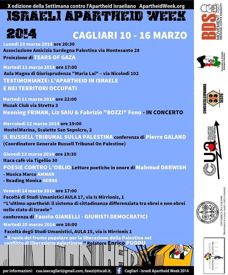 In occasione della X edizione del IAW – Settimana contro l’apartheid israeliano – nella città di Cagliari si terranno i seguenti eventi [vedi allegato]: