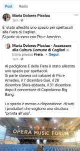 Resta la Fiera, ma da anni lo spazio di viale Diaz presenta i segni del tempo e non cattura più i cuori dei cagliaritani. E si arriva così all’Opera Musica Forum, struttura realizzata dall’ente fieristico annunciata con enfasi dall’assessora alla Cultura nella propria pagina Facebook: “Al padiglione E della Fiera è stato allestito uno spazio per spettacoli”, ha scritto venerdì scorso la Picciau, “si parte stasera col cabaret di Pio e Amedeo, il 7 dicembre Guè, il 28 dicembre Sfera Ebbasta, il 31 dicembre dopo il concertone di Capodanno Big Bang. Lo spazio è messo a disposizione di tutti i produttori che vogliono una struttura pronta all’uso”.
