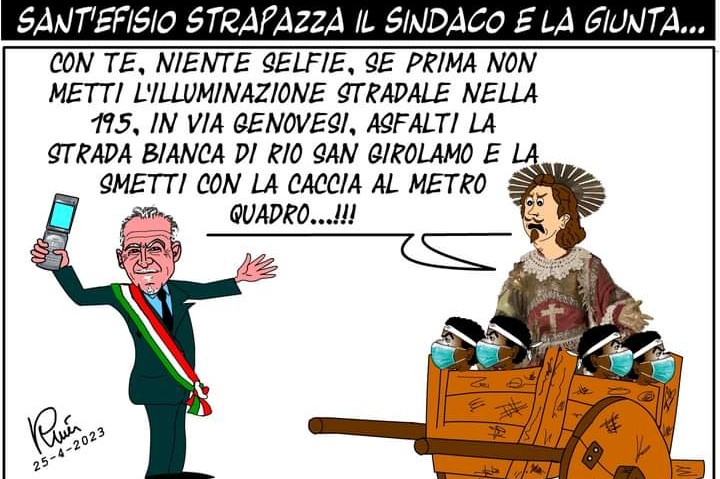 Si scomoda Sant’Efisio per l’illuminazione della Ss 195, buia da tempo, e sui social si scatena l’ironia della satira: “Niente selfie se prima non metti l’illuminazione stradale nella 195, in via Genovesi, asfalti la strada bianca di Rio San Girolamo e la smetti con la caccia al metro quadro”. Uno è il Santo, la trasferta da Cagliari a Nora è oramai imminente come la tappa a Capoterra, l’altro è il sindaco Beniamino Garau in procinto di una foto ma “punito” da Efisio che raccomanda di intervenire su alcuni punti che chiedono a gran voce i cittadini. La satira pungente, un’ironia nuda e cruda che va dritta al sodo, senza troppi giri di parole e, anche in questo caso, centra in pieno il nocciolo della questione. L’autore, Claudio Ruiu, vignettista conosciuto non solo in città, ha preso spunto dal servizio di Casteddu Online https://castedduonline.it/capoterra-la-ss-195-e-al-buio-alcuni-residenti-si-appellano-anche-a-santefisio pubblicato due giorni fa e in poche ore la sua rappresentazione ha fatto il giro del web. Un appello anche da parte del Santo più amato dai sardi, insomma, all’amministrazione di Capoterra che ogni giorno tanto fa e che, passo dopo passo, continua a sistemare le questioni che riguardano la comunità e ben vengano le segnalazioni da parte dei cittadini, che mostrano quali sono le criticità più evidenti. Scherzi a parte, satira e lodato pure, la questione dell’illuminazione nel tratto buio della statale che interessa il centro abitato è un richiamo affinché chi transita nella zona possa farlo senza correre troppi rischi: basterebbe più attenzione alla guida e una velocità moderata ma ciò spesso, purtroppo, non accade e la paura è sempre tanta in una delle arterie maggiormente percorse dai residenti e non solo.