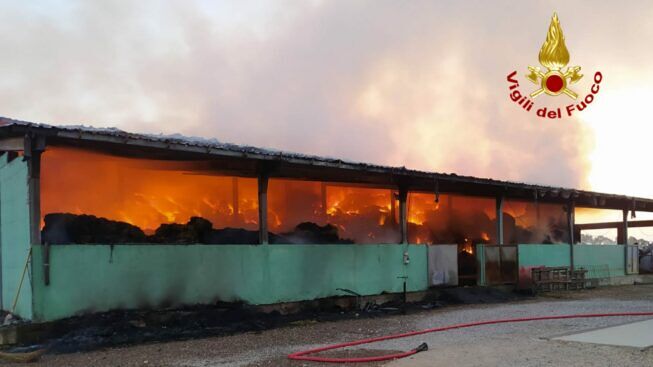Intervento dei Vigili del Fuoco del distaccamento di Iglesias in atto dalle 3 in località Is Sindigaus in territorio del comune di Siliqua, per spegnere un vasto incendio che si è sviluppato all’interno di un’azienda agricola: in fiamme numerose balle di fieno accatastate all’interno di due strutture.