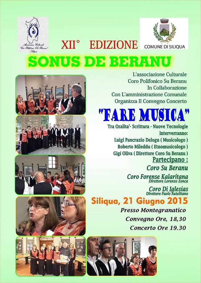 L’associazione culturale Coro Polifonico Su Beranu in collaborazione con l’amministrazione Comunale di Siliqua organizza il convegno concerto denominato “Fare musica”. Tra oralità, scrittura e nuove tecnologie interverranno: Luigi Pancrazio Delogu (musicologo), Roberto Mileddu (etnomusicologo), Gigi Oliva (direttore Coro Su Beranu). Oltre al coro polifonico Su Beranu di Siliqua (che ha organizzato l’evento) è prevista la partecipazione del coro Forense Karalitana (diretto dal Maestro Lorenzo Zonca) e del Coro di Iglesias (diretto dal Maestro Paolo Autelitano). La manifestazione è prevista domenica 21 giugno nei locali del Montegranatico, in via Umberto I. Alle ore 18,30 ci sarà il convegno e alle ore 19,30 il concerto. L’associazione culturale Coro Polifonico Su Beranu, presieduta da Pierpaolo Deidda, da dodici anni anima la musica corale nell’hinterland, si è formata a febbraio del 2004 sotto la direzione della Maestra Maria Bonaria Todde.Iniziò come coro femminile, poi dal 2007 si aggiunsero le voci maschili. Dal mese di luglio dello stesso anno il coro fu diretto dal Maestro Massimo Atzori, mentre da ottobre del 2010 è sotto la direzione artistica del Maestro Luigi Oliva. Lo scopo principale del Coro è quello di mantenere vive le tradizioni della musica popolare sarda, sacra e profana. Il Coro polifonico Su Beranu si è esibito in numerose manifestazioni: ha partecipato a raduni regionali quali “Etnika” (organizzata dalla Provincia di Cagliari ), ha preso parte ad iniziative a scopo benefico come “Telethon“ (organizzata dall’Agenzia delle Entrate), è poi intervenuto alla trasmissione televisiva “Anninnora”. Inoltre, ha tenuto vari concerti nell’Isola e oltre Tirreno: nel mese di giugno del 2008 ha partecipato all’11°Festival di canto corale in Val Pusteria, in Alto Adige (unico Coro sardo a rappresentare la Sardegna), riscuotendo un grande successo di pubblico e di critica. Poi, si è esibito al Festival Internazionale dei Gruppi Corali a Pineda De Mar, in Spagna. Tra gli appuntamenti annuali organizza la manifestazione ”Sonus de Beranu” che si svolge in genere tra maggio e giugno.