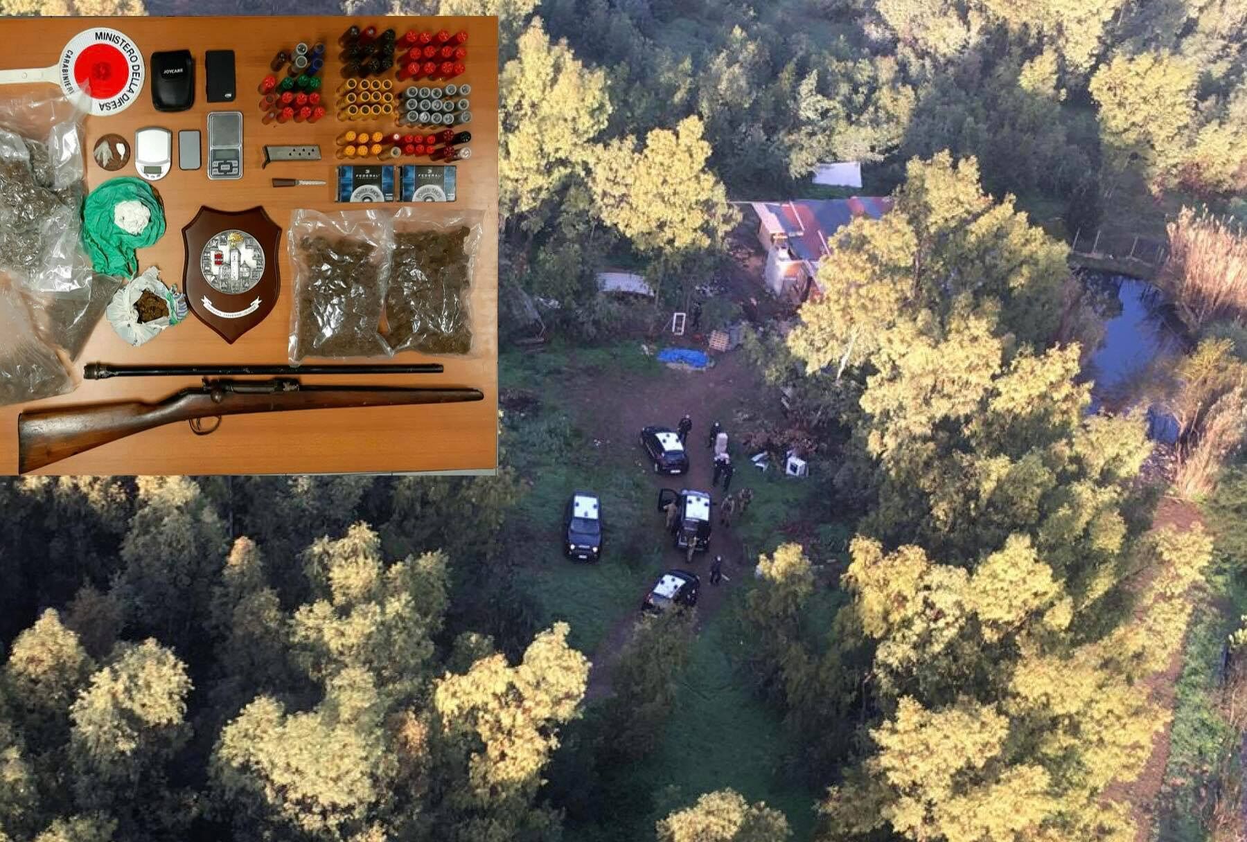 Nel blitz che ha visto un grande dispiegamento di uomini sono stati coinvolti circa 40 carabinieri, 2 unità cinofile ed un elicottero per il supporto aereo. In manette è finito un pluripregiudicato di 52 anni, trovato in possesso di 81 grammi di cocaina, 745 grammi di marijuana, un fucile clandestino e 84 cartucce di vario calibro, il tutto occultato all’interno di un ovile di cui è proprietario.