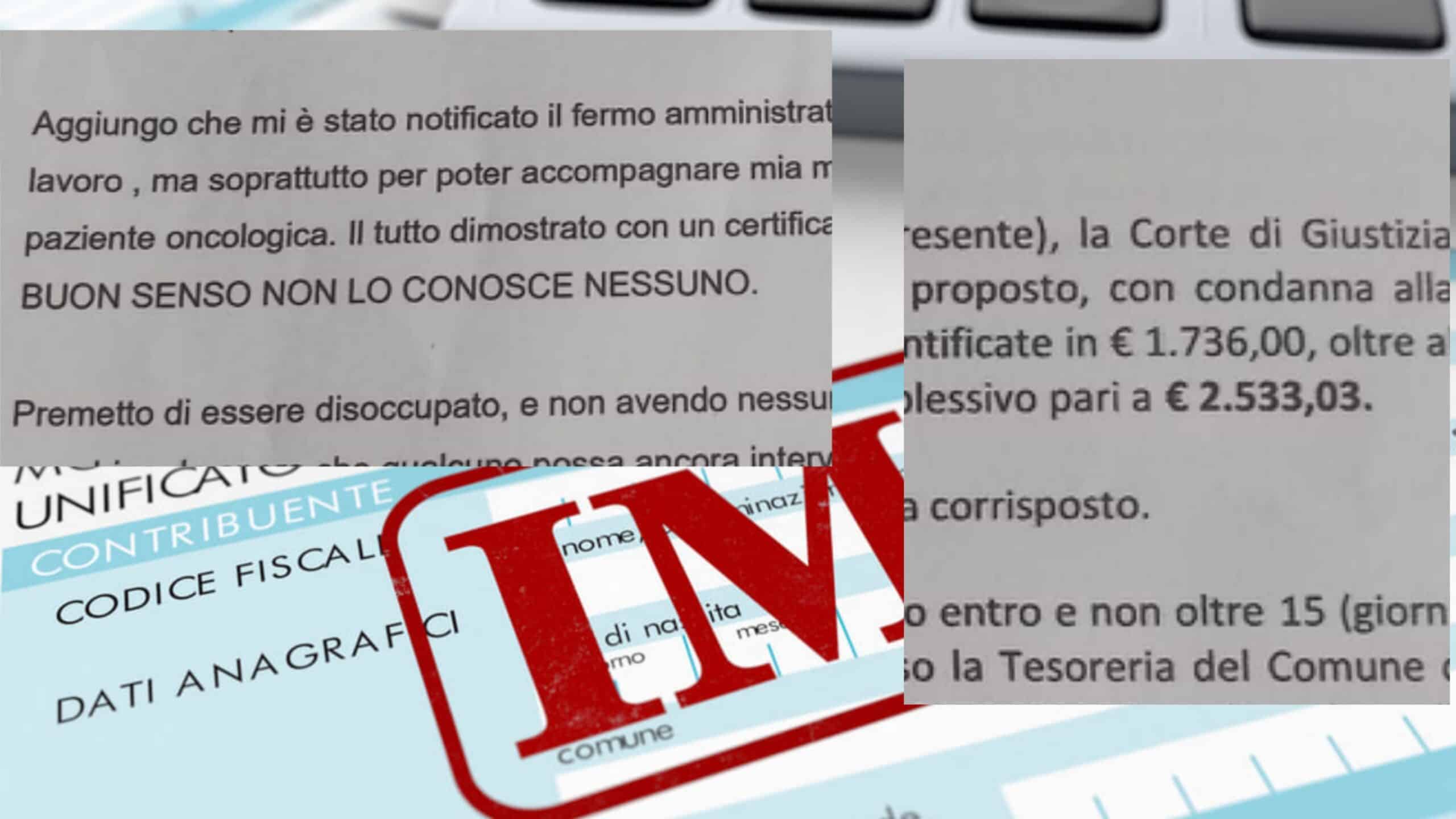 Aggiungo che mi è stato notificato il fermo amministrativo alla mia macchina, unica risorsa in caso di lavoro, ma soprattutto per poter accompagnare mia moglie alle visite programmate essendo una paziente oncologica. Il tutto dimostrato con un certificato medico, ma anche in questo contesto il BUON SENSO NON LO CONOSCE NESSUNO.