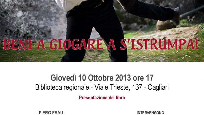 Giovedì 10 ottobre alle 17, presso la Biblioteca Regionale in viale Trieste 137 a Cagliari, sarà presentato il libro “S’Istrumpa” di Piero Frau, edito da Alfa Editrice. Il volume propone un’analisi di spiccato approfondimento didattico su una delle forme di espressione fisica fra le più remote nel Mediterraneo, offrendo una relazione esaustiva e sistematica della disciplina, a partire dalla vicende storiche più antiche fino alla sua diffusione nell’isola.