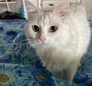È una gattina dolcissima ma paurosa dal pelo lungo bianco.