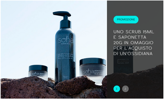- uno scrub da 15 ml e una saponetta da 20 gr in omaggio per l’acquisto di un prodotto della linea Ossidiana (https://www.sohasardinia.com/it/58-ossidiana)