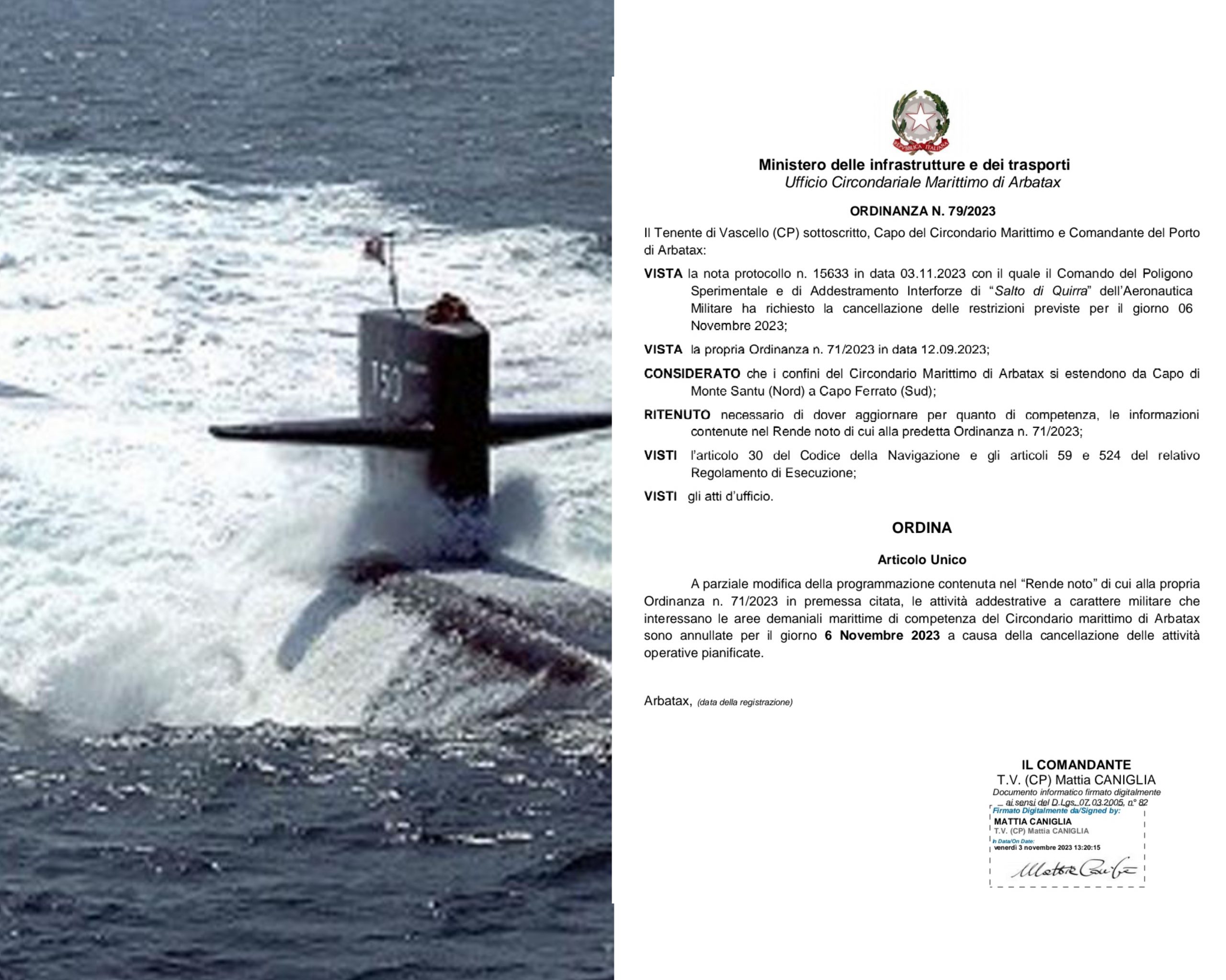 Da allerta massima a evento annullato, tutto in poche ore. Il sommergibile che avrebbe dovuto fare avanti e indietro nella costa orientale della Sardegna e che ha portato l’ufficio marittimo di Arbatax a diramare un “bando di pericolosità”? Stracciato. La notizia viene data dalla stessa Guardia Costiera, con tanto di nuova ordinanza ad hoc. Mare libero, quindi, per i pescatori e per tutte le imbarcazioni. E si scopre che la richiesta era arrivata dal Comando del poligono sperimentale e di addestramento del Salto di Quirra, con in mezzo l’Aeronautica militare.