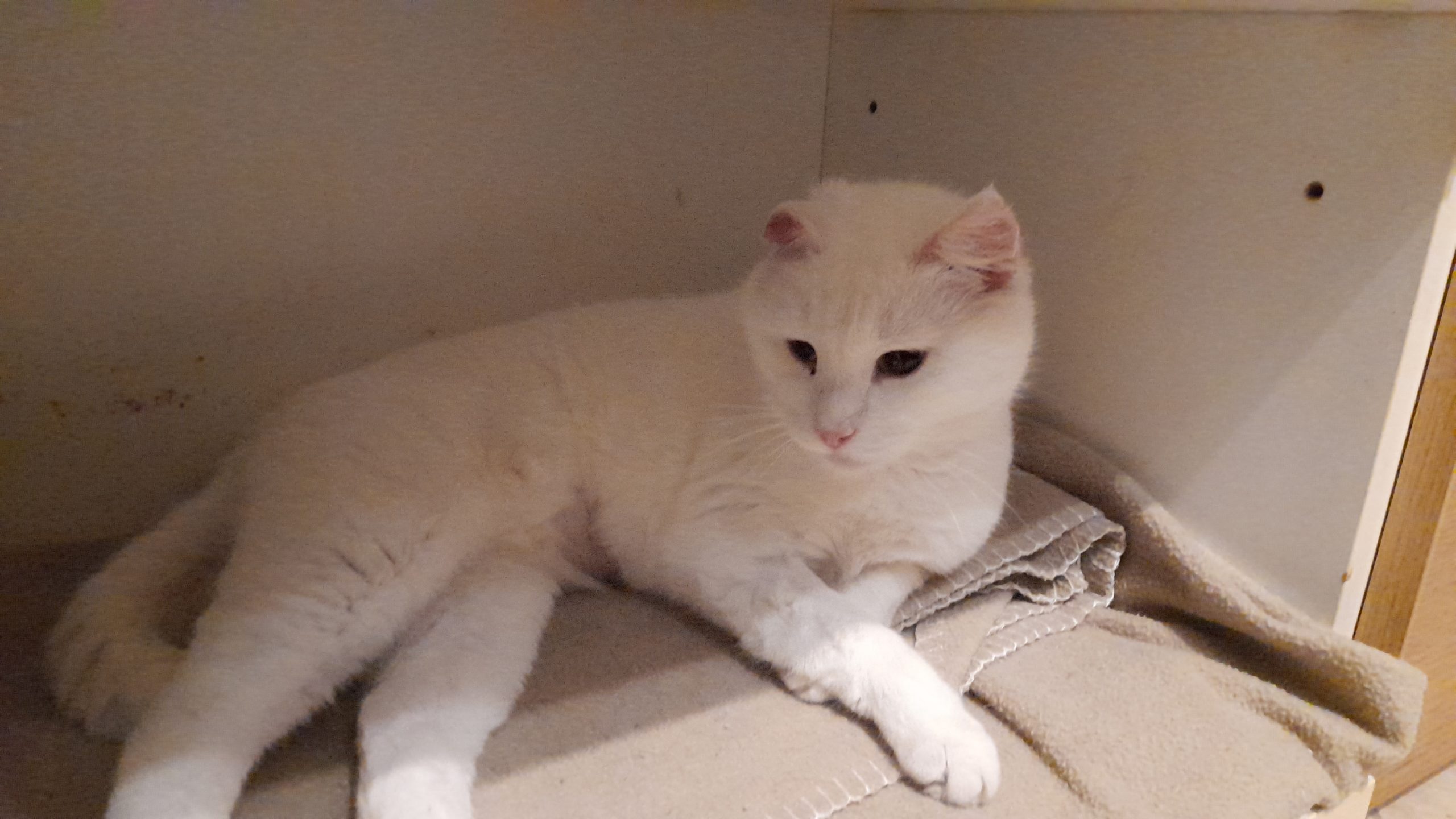 La bianchissima micina ha scoperto il calore di una cuccia e delle morbide copertine che adore immensamente, adesso le spetta conoscere l’ amore di una vera famiglia.