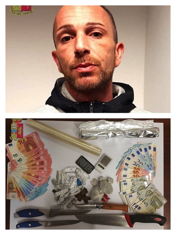 Nell’abitazione del 44enne gli Agenti hanno recuperato un bilancino di precisione, due coltelli con le lame intrise di sostanza resinosa e la somma di 600 euro in banconote di piccolo taglio.
