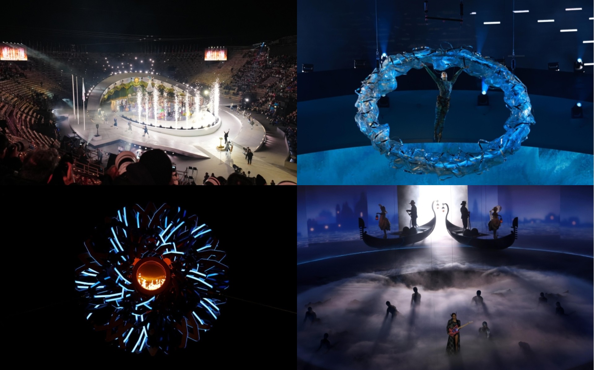 Spazio dedicato alla danza con Ramon Agnelli, solista principale della Scuola di Ballo del Teatro dell’Opera di Roma, e altri 16 danzatori. Altro momento emozionante con un video celebrativo per ringraziare i quasi 20 mila volontari, che hanno dato il loro contributo ai Giochi senza percepire compensi, giunti da oltre 70 paesi diversi, sulle note di ‘Blue’ con Gabry Ponte in consolle.
