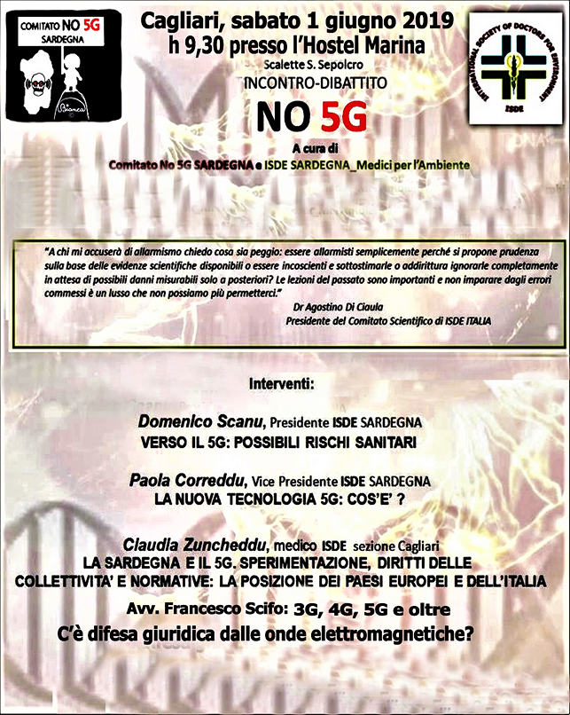 ISDE Italia, nel rispetto del Principio di Precauzione ha ritenuto opportuna la richiesta di due moratorie per l’esecuzione delle “sperimentazioni 5G” su tutto il territorio italiano, Sardegna compresa, sino a quando non sia adeguatamente pianificato un coinvolgimento attivo degli enti pubblici deputati al controllo ambientale e sanitario e non siano messe in atto valutazioni preliminari di rischio secondo metodologie codificate e un piano di monitoraggio dei possibili effetti sanitari sugli esposti, che dovrebbero in ogni caso essere opportunamente informati dei potenziali rischi nel rispetto della normativa europea.