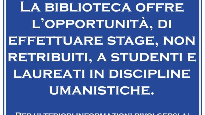 “La Biblioteca Universitaria di Cagliari, offre l’opportunità, di effettuare stage, non retribuiti, a studenti e laureati in discipline umanistiche. Per ulteriori informazioni rivolgersi a: [email protected]”.