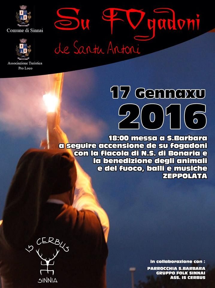 La Pro Loco e il Comune di Sinnai con la collaborazione della maschera Is Cerbus il Gruppo Folk Sinnai e la Parrocchia Santa Barbara organizzano per il giorno 17 Gennaio 2016 ” Su Fogadoni de Santu Antoni ” . Alle ore 18 si celebrerà la Santa Messa cantata dal coro S’ Arrodia. Per festeggiare il 30° anniversario del Pellegrinaggio di Bonaria verrà benedetta la fiaccola che accenderà il fuoco. Dopo la benedizione degli animali e del fuoco Is Cerbus faranno la loro prima uscita, la loro rappresentazione aprirà il carnevale. Seguiranno balli di gruppo al suono dell’ organetto e zeppolata per tutti i partecipanti.