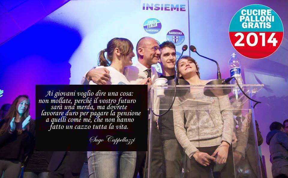 “Contro la disoccupazione fatti un amico in Regione, migliaia di accozzi in pochi anni”. Sul web impazzano le pagine e i siti satirici sui politici e la politica sarda, nati in occasione della campagna elettorale in Sardegna. Una di queste è la pagina facebook “Sugo 2014”, nata da qualche giorno e che ironizza sul candidato del centrodestra Ugo Cappellacci. Frasi pungenti ma simpatiche che descrivono il presidente regionale uscente con un pizzico di ironia. “Ai giovani voglio dire una cosa: non mollate, perché il vostro futuro sarà una merda, ma dovrete lavorare duro per pagare la pensione a quelli come me, che non hanno fatto un cazzo tutta la vita”, si legge in una degli slogan della pagina satirica firmato Sugo Cappellazzi. E poi una frase sulla nuova continuità territoriale, cavallo di battaglia di Cappellacci. “D’ora in poi sempre in cricca! Non è bello fare il viaggio con la metà dei posti vuoti vero? Con al nuova continuità territoriale o si raggiunge il 50 per cento dei posti occupati, o non si parte più”.