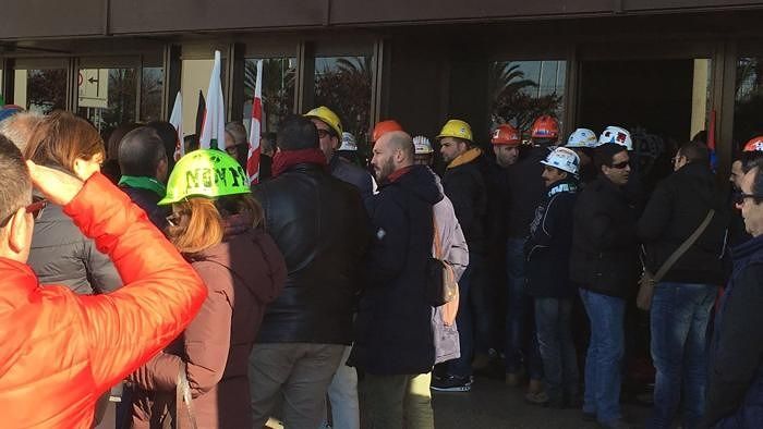 Caschetto in testa e promessa di battaglia, il presidente della Regione Christian Solinas insieme ai lavoratori della SiderAlloys per l'incontro ...