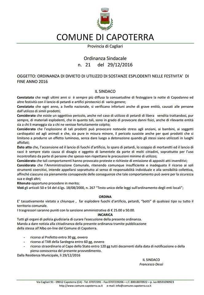 Il Sindaco Stefano Delunas ha disposto il divieto di far esplodere petardi e simili in tutte le aree pubbliche e private tra le ore 23 del 30 dicembre e le ore 24 del 6 gennaio