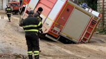 L'incidente in via Brescia, una delle strade più colpite dall'alluvione. Salvi i due pompieri a bordo, il mezzo tirato su ...