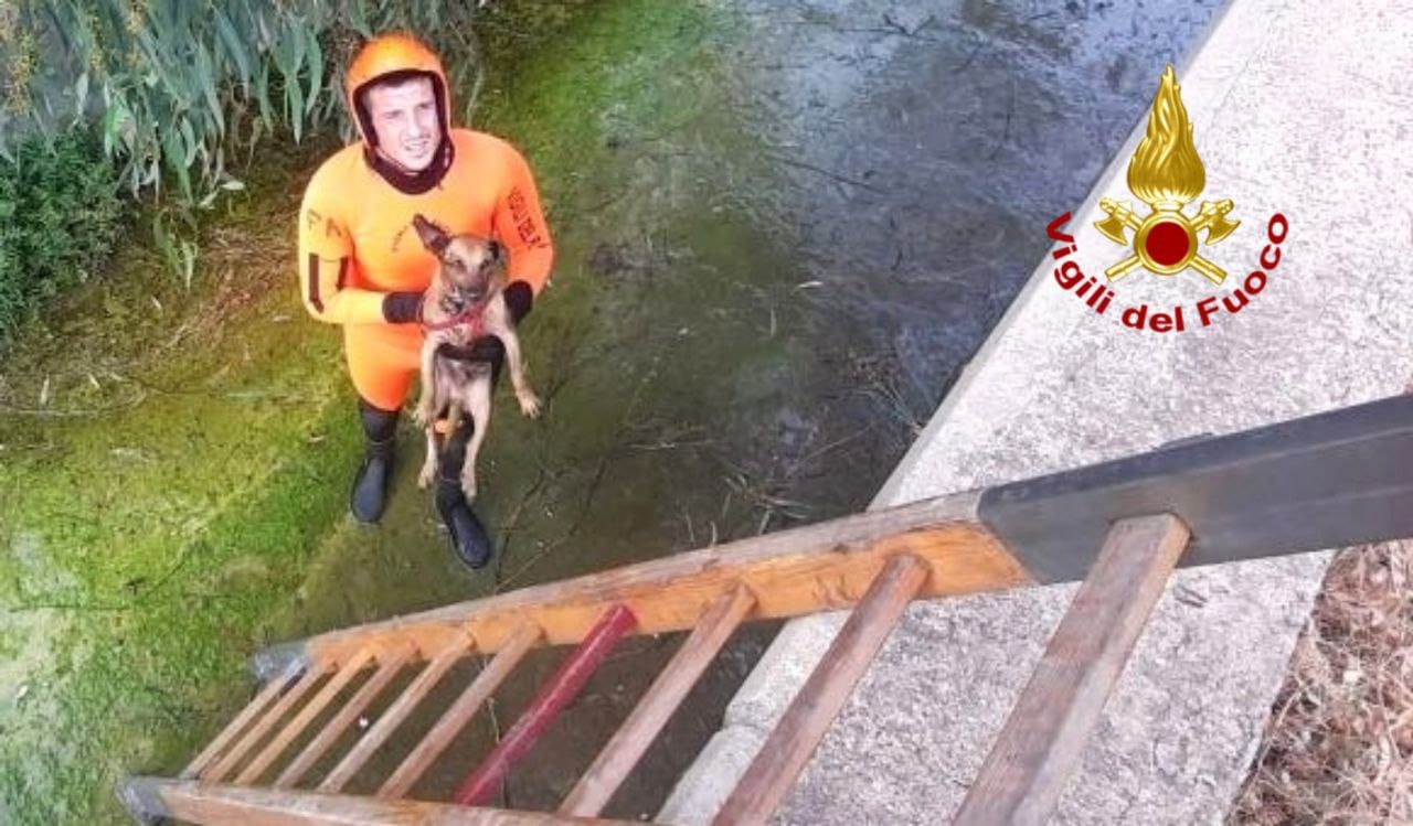Dopo ore di ricerche, i vigili hanno localizzato e raggiunto il cane che spaventato, stanco e disorientato, non riusciva a ...