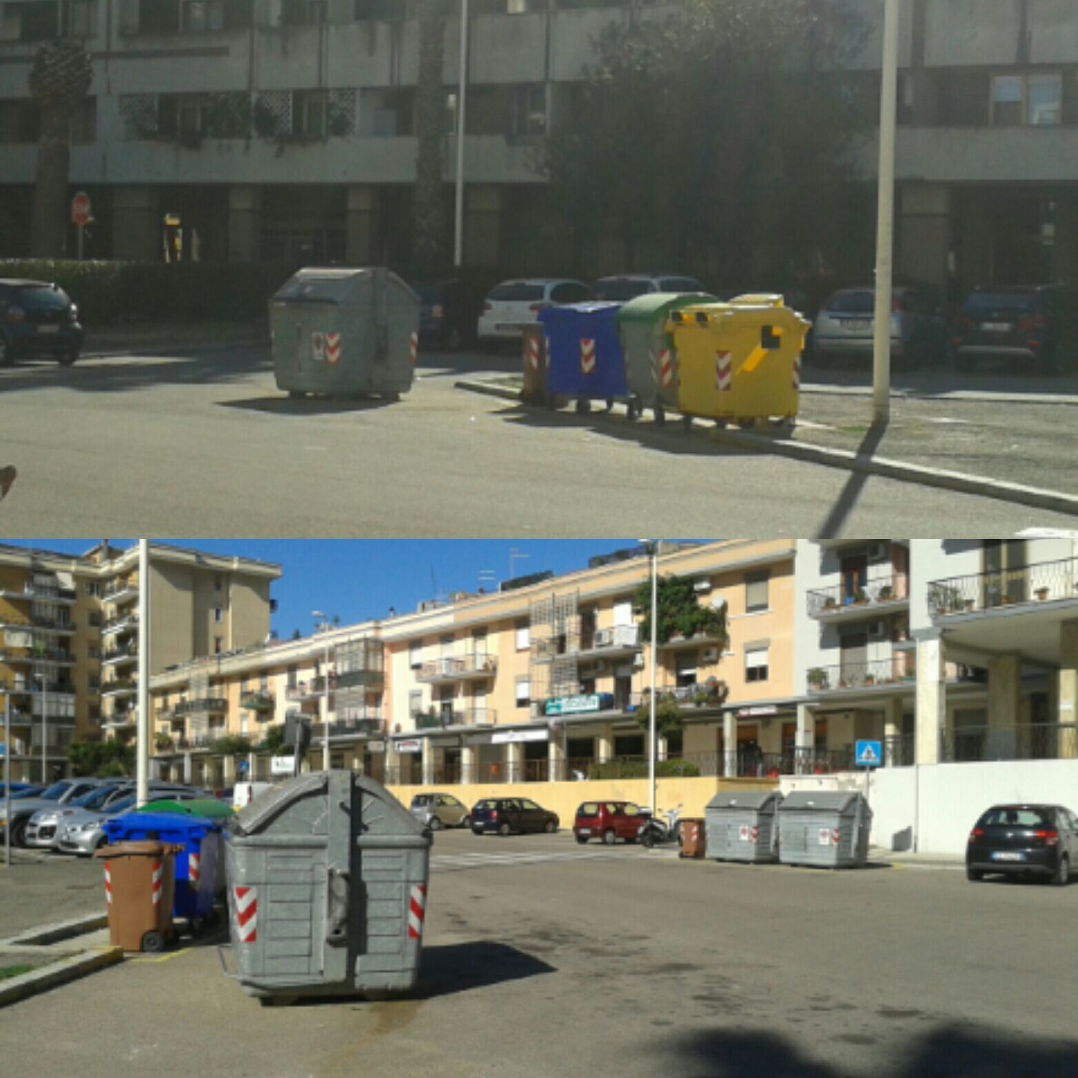 Cassonetti dei rifiuti sui parcheggi dei disabili a Pirri, in via Santa Maria Chiara: residenti indignati
