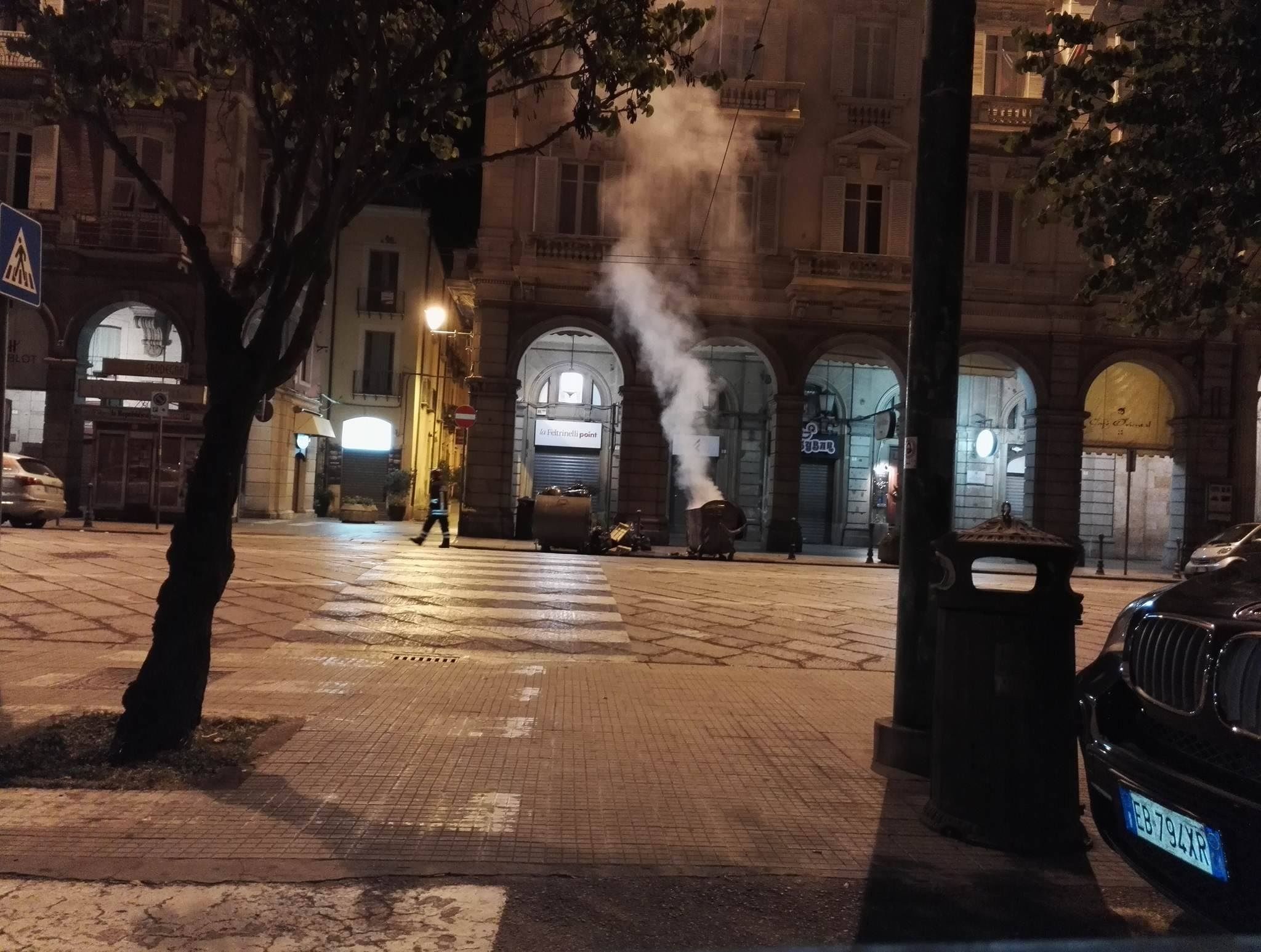 Vigili del fuoco in azione nella notte, in via Roma cassonetti in fiamme: caccia alla banda di teppisti