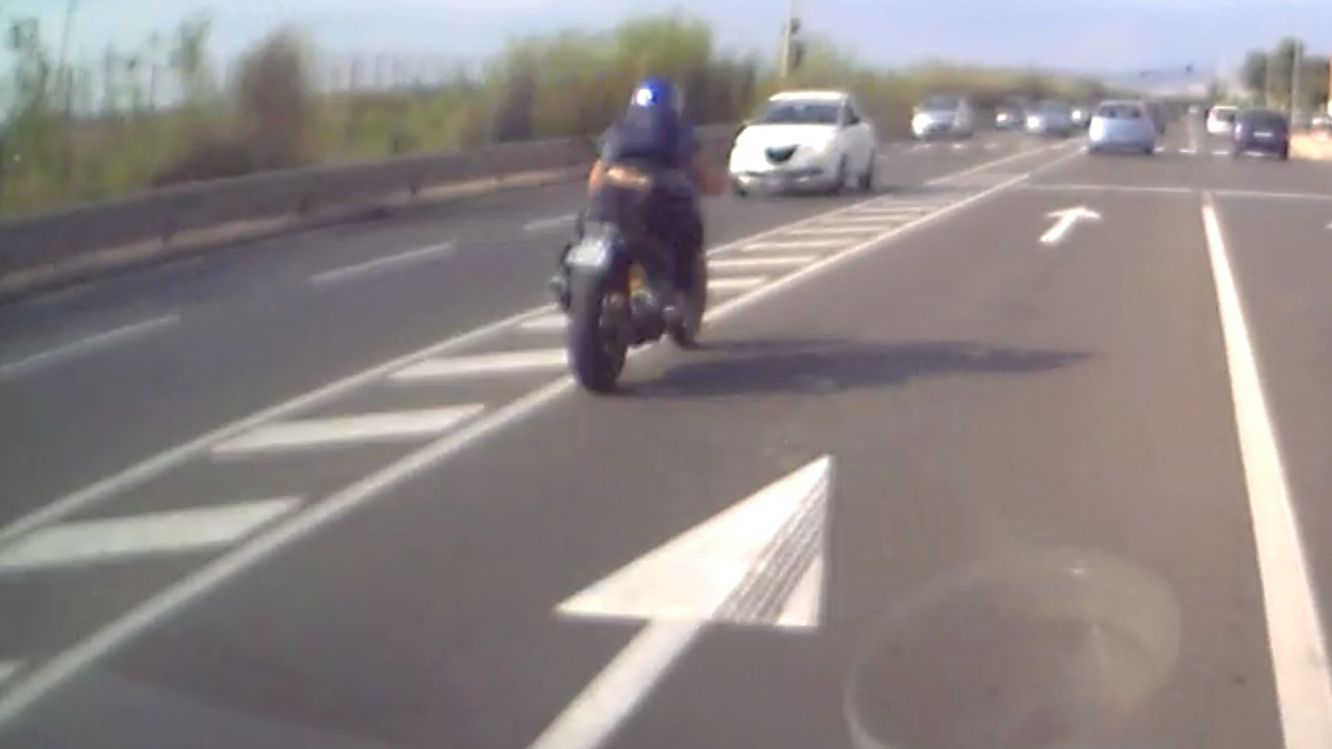 Un motociclista correndo all'impazzata dribbla le auto, sfiora la carreggiata opposta, ben oltre il limite consentito. Una folle sfida contro ...