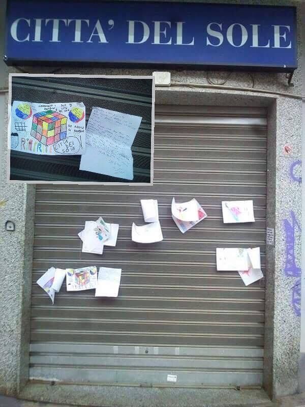 La serranda di via Oristano abbassata da giorni dopo 28 anni di attività è tappezzata da disegni, lettere, appelli disperati ...