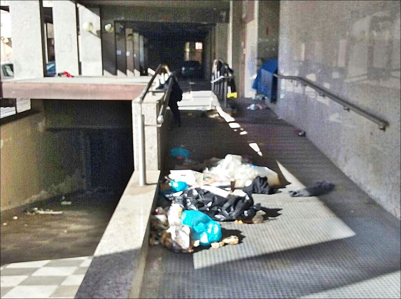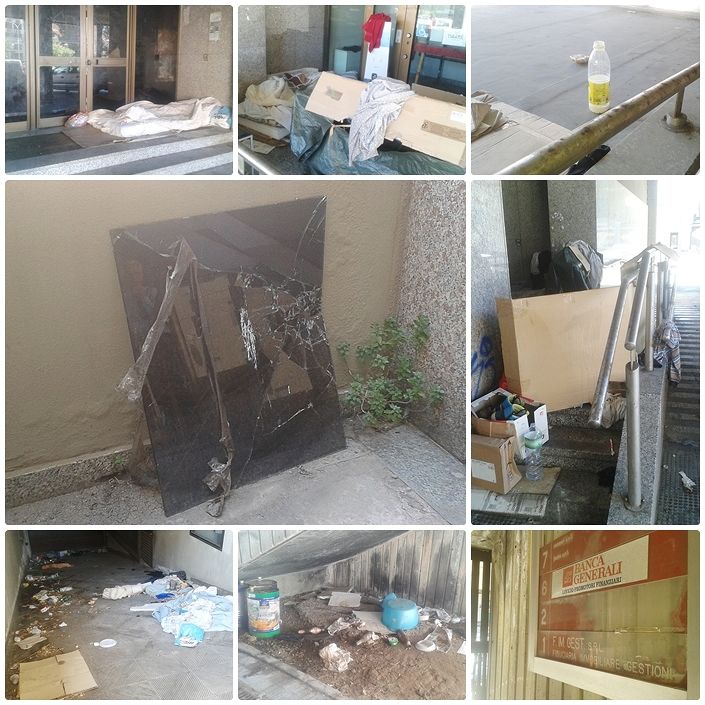 Una situazione igienico-sanitaria allarmante: nulla è cambiato sotto il palazzone dell'ex Cariplo, c'è chi sfonda i vetri per entrare dentro ...